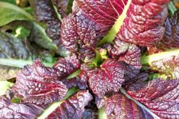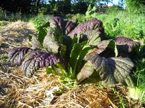 Large round leaved, purple edged, mild mustard spinach, for salads or stir-fry, flowers are delicious and flower stems make a great vegetable.